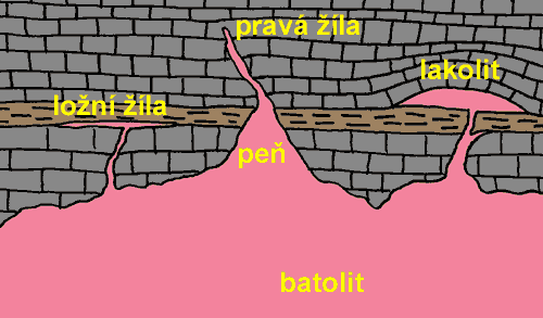 Žíly: Deskovitá tělesa, jejichž délka je mnohem větší než šířka. Rozlišujeme žíly ložní a pravé viz obrázek.