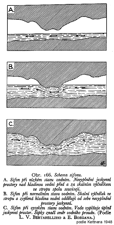 Sifony jsou běžné v podzemních krasových prostorách a vznikají v místě, kde se náhle zužuje průřez chodby - viz obrázek připojený k odpovědi. Při průtoku vody sifonem dochází ke značnému zvýšení tlaku. Sifony jsou překážkou při průzkumu jeskyních prostor.
